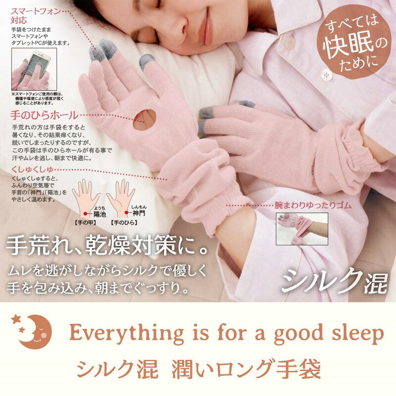 ●腕まわりゆったりゴム ●指先から手首まではシルク100% 手肌に潤いを。